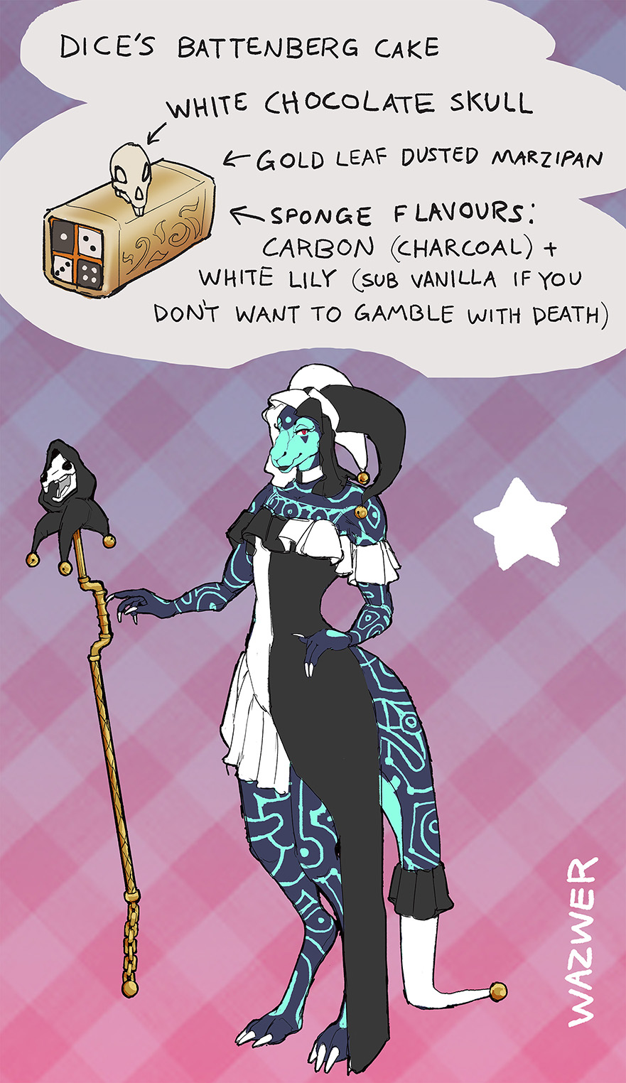 serious or funny. Likes to mess with people. Fascinated by death. Very theatrical and chaotic but also